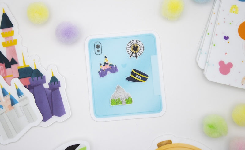 This sticker features a blue iPad back cover adorned with mini Disney-inspired icons—from the castle to the Ferris wheel to the conductor’s hat. Crafted from waterproof, weather-proof vinyl with a matte finish, it’s built to withstand daily use on laptops, water bottles, or travel gear. It’s a clever nod to park day style and Disney tech charm.