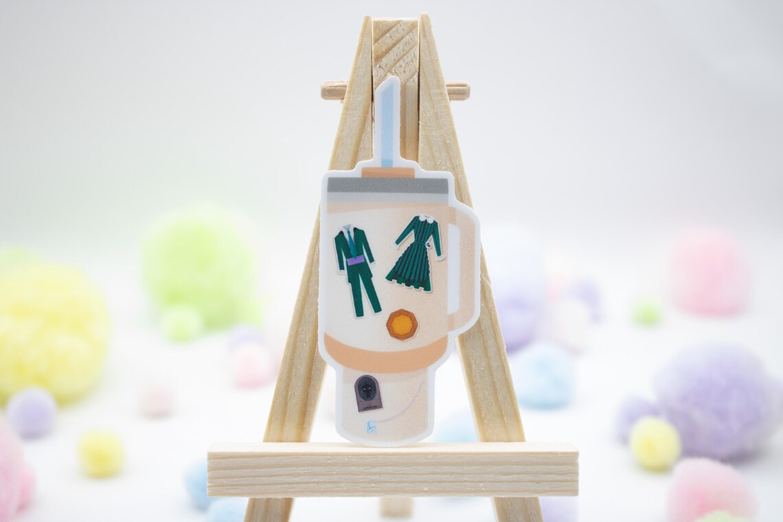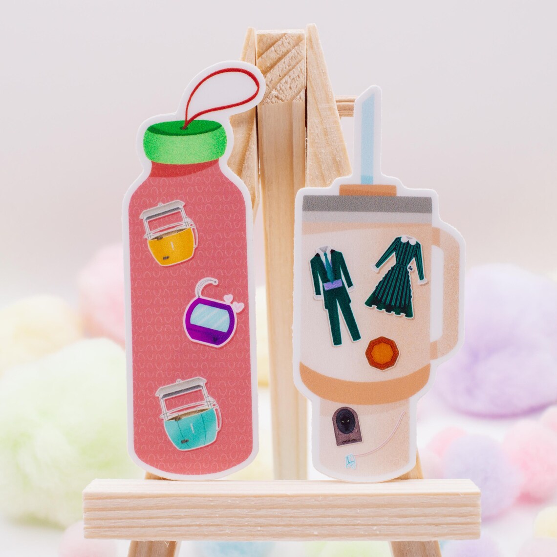 Add fun flair to your drinkware with this bundle of two die-cut Disney stickers styled like to-go cups—one features a bright pink bottle and lime green lid covered in miniature Skyliner and Skyway motifs, and another cream-colored Stanley-type tumbler is wrapped in tiny Haunted Mansion icons.