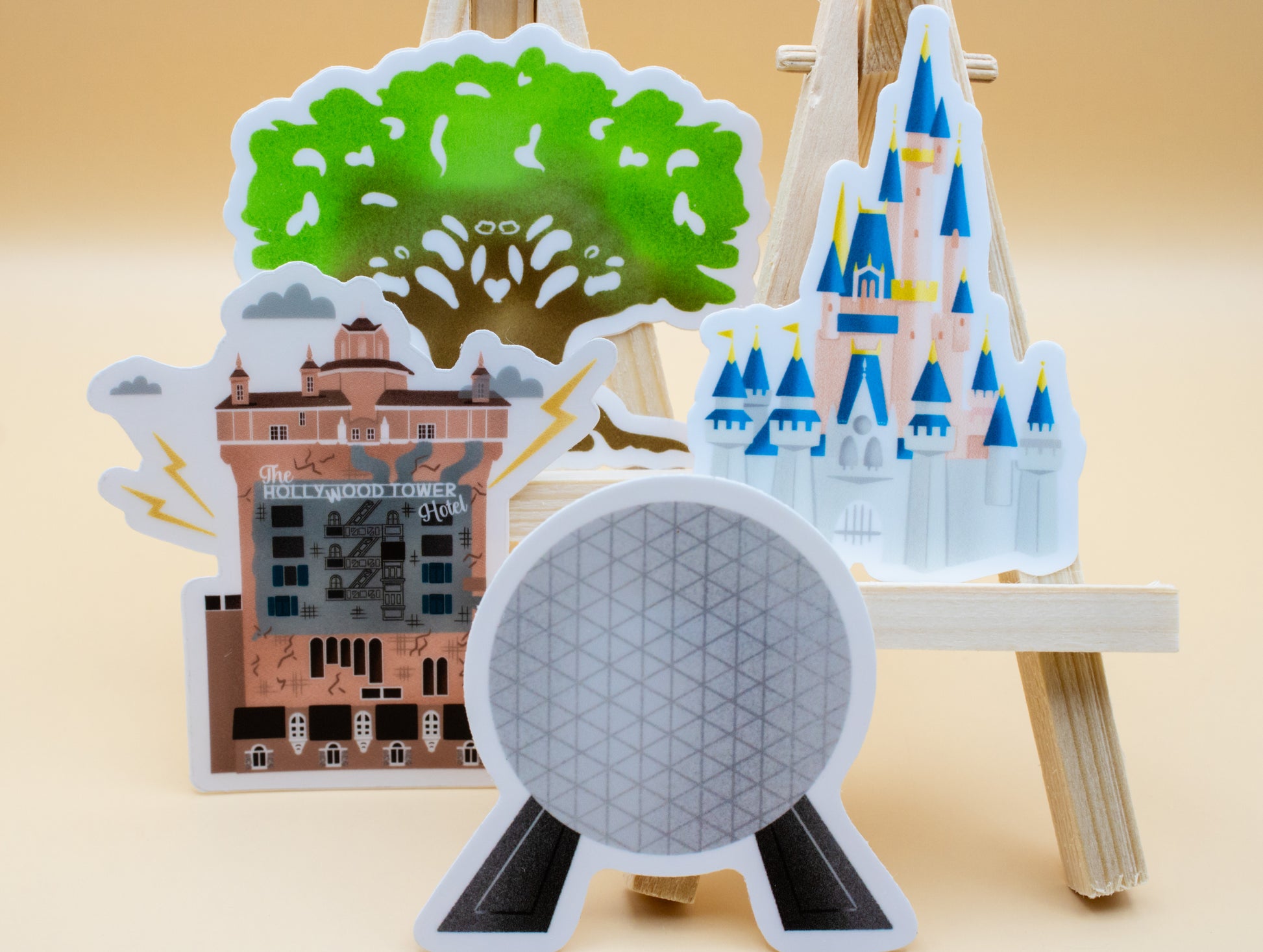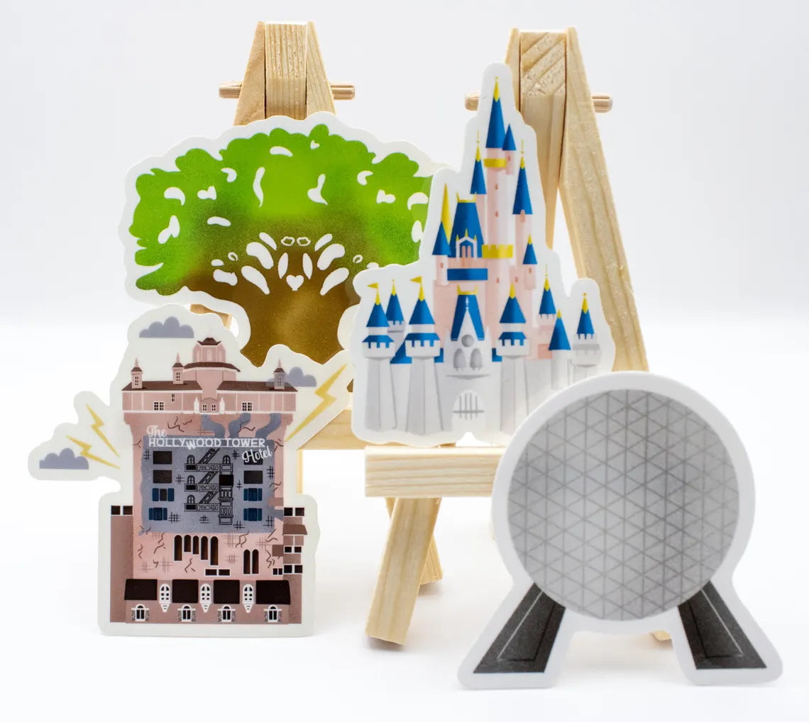 Celebrate your favorite theme parks with this sticker set featuring four iconic Walt Disney World landmarks: Cinderella Castle, Spaceship Earth, the Hollywood Tower Hotel, and the Tree of Life.