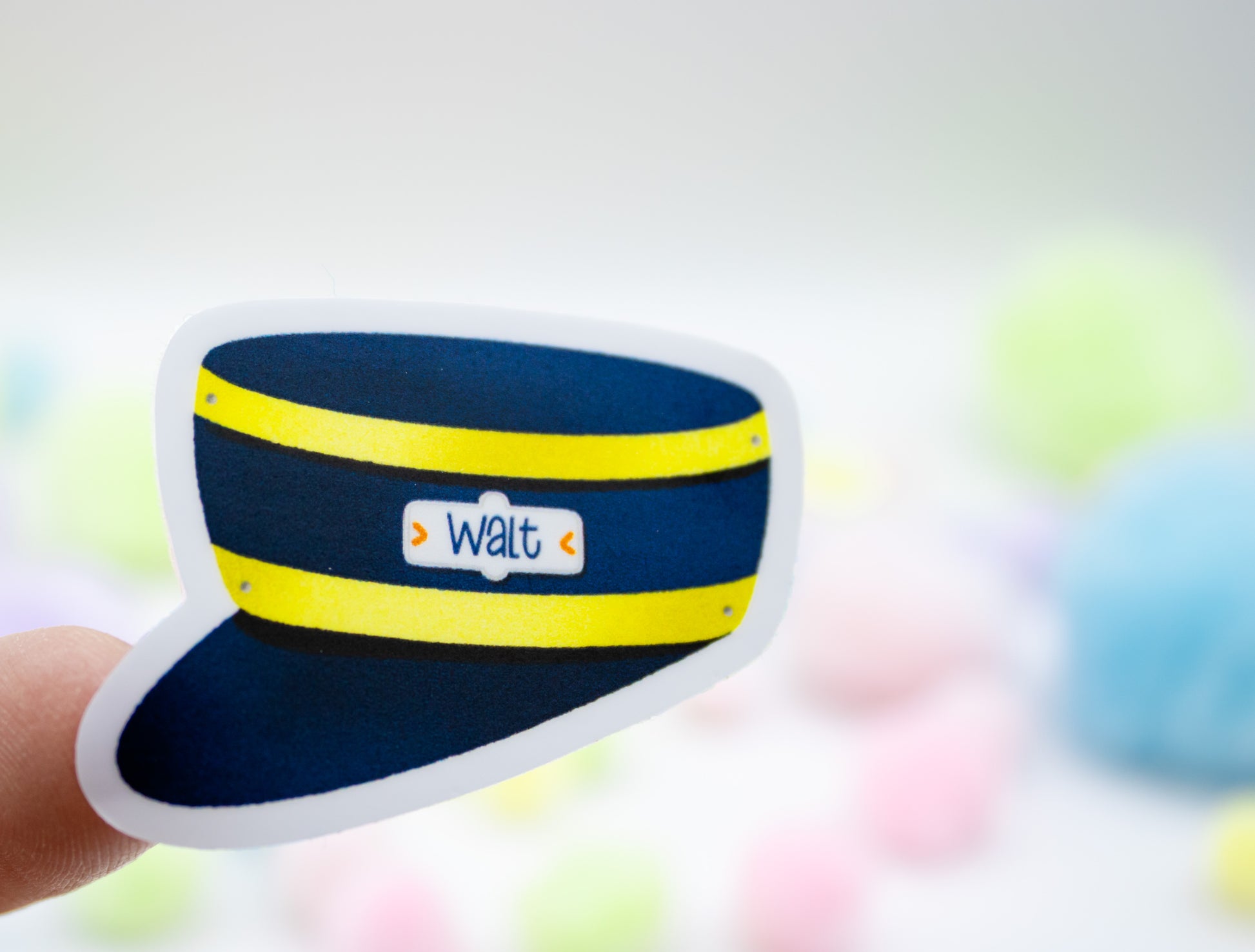 Show your love for the famed WDW and Disneyland railroads with this vinyl sticker featuring a classic train conductor hat, complete with Walt’s name across the front. Made from premium, waterproof vinyl with a matte finish and crisp die-cut edges, it’s ideal for decorating laptops, water bottles, travel gear, or any surface that deserves a touch of Disney history. This sticker captures the timeless charm of Walt’s beloved railroad and makes a perfect keepsake for park fans.